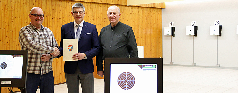 Lauterbach. Mit 4.450 Euro beteiligt sich der Vogelsbergkreis an den Investitionen, die der Sportschützenverein Lauterbach 1562 e. V. an seiner Anlage vorgenommen hat. Als Jäger ließ es sich Landrat Manfred Görig natürlich nicht nehmen, den Förderbescheid selbst zu überbringen und sich von den beiden Vorsitzenden, Stefan Scheuring und Klaus Scharmann, durch das Vereinsheim führen zu lassen. „Eine moderne Anlage ist das hier geworden, wie man sie auch bei Wettkämpfen im Fernsehen sieht“, zeigt sich der Landrat beeindruckt. Im Keller des Vereinsheimes wurde der Luftdruckwaffenstand auf Elektronik umgerüstet: „Wir haben hier acht Zehn-Meter-Bahnen nebeneinander, alle funktionieren mit einer Touchscreen“, erläutert Stefan Scheuring.