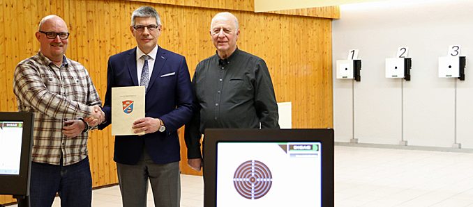 Lauterbach. Mit 4.450 Euro beteiligt sich der Vogelsbergkreis an den Investitionen, die der Sportschützenverein Lauterbach 1562 e. V. an seiner Anlage vorgenommen hat. Als Jäger ließ es sich Landrat Manfred Görig natürlich nicht nehmen, den Förderbescheid selbst zu überbringen und sich von den beiden Vorsitzenden, Stefan Scheuring und Klaus Scharmann, durch das Vereinsheim führen zu lassen. „Eine moderne Anlage ist das hier geworden, wie man sie auch bei Wettkämpfen im Fernsehen sieht“, zeigt sich der Landrat beeindruckt. Im Keller des Vereinsheimes wurde der Luftdruckwaffenstand auf Elektronik umgerüstet: „Wir haben hier acht Zehn-Meter-Bahnen nebeneinander, alle funktionieren mit einer Touchscreen“, erläutert Stefan Scheuring.