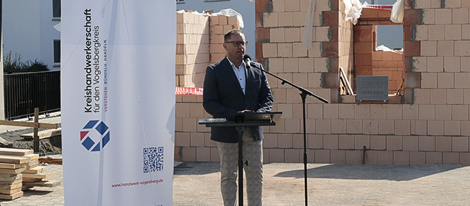 Landrat Dr. Jens Mischak zeigte sich erfreut über den fortgeschrittenen Bau und betonte die enge Zusammenarbeit während der Entscheidungsphase. Der Neubau sei nicht nur für die Kreishandwerkerschaft von großer Bedeutung, sondern setze auch ein starkes Signal für die gesamte Region und das Handwerk. Bürgermeister Rainer-Hans Vollmöller äußerte sich zufrieden darüber, dass die Kreishandwerkerschaft auch zukünftig in der Kreisstadt Lauterbach angesiedelt bleibe. Er wies auf die Synergien hin, die durch die räumliche Nähe zur Berufsschule und zum Lehrbauhof entstünden, und sah darin eine große Chance für die Ausbildung und Förderung junger Handwerker. Joachim Wagner, Vizepräsident der Handwerkskammer Wiesbaden, lobte den Mut und die Entschlossenheit der Kreishandwerkerschaft, in den Neubau zu investieren. Er habe den Entscheidungsprozess über mehrere Jahre hinweg begleitet und sehe in dem Neubau einen wichtigen Schritt zur Stärkung des Handwerks in der Region.