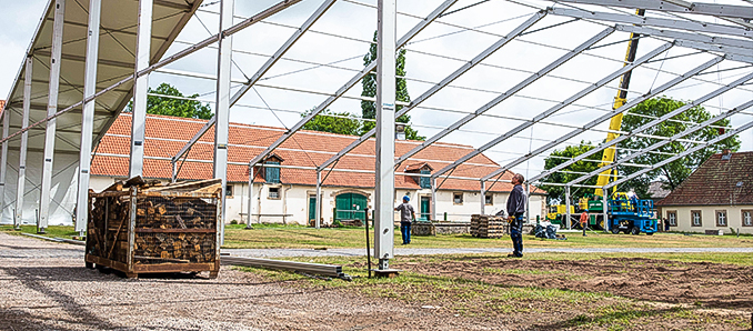 Die große Feier zum Kreisjubiläum nimmt Gestalt an: Am Dienstag ist mit dem Aufbau des Festzeltes begonnen worden. Gestern wurde die mächtige Metallkonstruktion im Hof von Schloss Fasanerie aufgestellt. Vom 24. bis 26. Juni wird auf dem Gelände ein breitgefächertes Unterhaltungsprogramm für alle Bürgerinnen und Bürger geboten. Ab sofort ist auch ein Video-Trailer online.