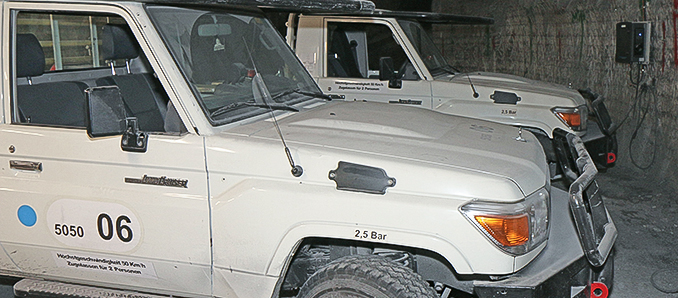 Für die dieselgetriebenen Geländewagen und Pick-ups, die bislang in den Bergwerken als Befahrungsfahrzeuge dienen, gibt es derzeit noch keinen serienmäßigen elektrischen Ersatz. In den vergangenen Jahren wurden Modelle mit emissionsarmen Dieselmotoren angeschafft, um den Schadstoffausstoß zu reduzieren. Inzwischen haben aber die ersten Hersteller angekündigt, ihre Geländewagen ab 2023 nicht mehr mit Dieselmotor zu vertreiben. „Aufgrund des von der EU beschlossenen Verbots von Verbrennungsmotoren werden langfristig ohnehin keine Fahrzeuge mit Dieselmotor mehr verfügbar sein – der Umstieg auf Elektrofahrzeuge muss auch in den Gruben kommen, und das müssen wir gut vorbereiten“, sagt Rickfelder. Wichtige Aspekte sind dabei neben der Alltagstauglichkeit und der Reichweite der Fahrzeuge auch eine geeignete Ladeinfrastruktur und die Sicherheit in der Grube.