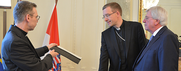 Weihbischof Dr. Gerber nahm die Gelegenheit des gegenseitigen Kennenlernens bereits vor der Amtseinführung gerne wahr und sprach die erst kürzlich begonnene Legislaturperiode an: „Sie haben in den kommenden Jahren zum Wohl des Landes viele Entscheidungen zu treffen. Dazu wünsche ich Ihnen Gottes reichen Segen. Der Treueid ist für den Bischof auch Anstoß, im Gebet um den Beistand des Heiligen Geistes zu bitten.“