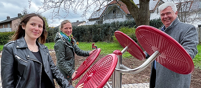 Auszubildende Rica Rimmel, Sabine Räth (Marketing) und Bürgermeister Timo Zentgraf im neuen Bewegungspark (v.li.) Foto: Gemeinde