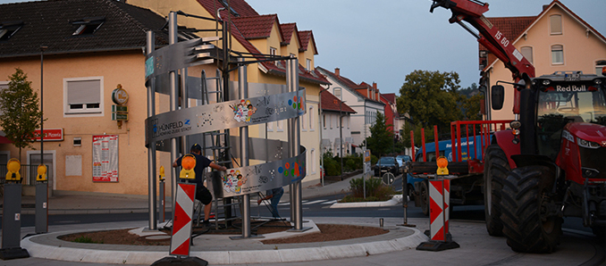 Auf dem Kreisel Mackenzeller Straße/Klingelstraße wurde ein neues Kunstwerk aufgestellt. Bürgermeister Benjamin Tschesnok erklärte, dass die Skulptur in Zusammenarbeit mit den umliegenden Schulen und Bildungseinrichtungen entstanden sei und auf den Standort Hünfeld mit seinen vielfältigen Angeboten aufmerksam machen soll.
