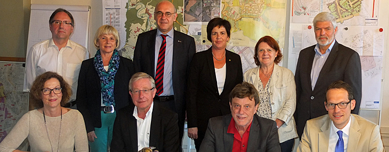 Ein gutes Gespräch im Stadtschloss. Hinten von links: Bernd Maul (Gemeinde Burghaun), Maria Schultheis (Bürgermeisterin Neuhof), Stefan Schwenk (Bürgermeister Hünfeld), Birgit Kömpel, Annette Sawade, Martin Thaler (Verkehrsdezernent Stadt Fulda). Vordere Reihe von links: Gudrun Jonas (Koordinatorin im Baudezernat der Stadt Fulda), Dieter Kolb (Bürgermeister Eichenzell), Karl-Josef Schwiddessen (Bürgermeister Petersberg) und Fuldas Stadtbaurat Daniel Schreiner.