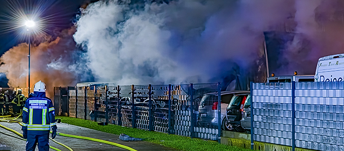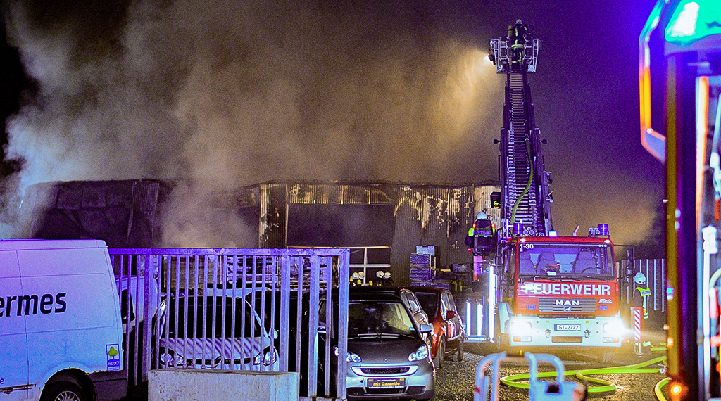 Bei einem Großbrand am späten Montagabend ist eine Halle im Gewerbegebiet „Langsdorfer Höhe“ in Flammen aufgegangen. Das Gebäude wurde komplett ein Raub der Flammen. Anwohner hatten am späten Abend kurz nach 22 Uhr das Feuer bemerkt und die Feuerwehr gerufen. Beim Eintreffen der ersten Kräfte stand das Gebäude eines Autohandels bereits im Vollbrand. Die Feuerwehr baute mit mehreren Strahlrohren eine Riegelstellung auf, um benachbarte Gebäude sowie zwei hinter der Halle abgestellte Laster vor einem Übergreifen der Flammen zu bewahren. Eine schwarze Rauchsäule war über Lich zu sehen. Die Bürger wurden vorsorglich mit „Katwarn“ dazu aufgefordert, Fenstern und Türen geschlossen zu halten. Die Messkomponente der Freiwilligen Feuerwehr Linden waren im Stadtgebiet, um an der Einsatzstelle im Einsatz die Schadstoffkonzentration zu messen. Über 150 Feuerwehrleute aus Lich waren am Einsatzort. Zudem waren weitere Spezialeinheiten aus dem Landkreis im Einsatz. Mittels Drehleiter und aus mehreren Strahlrohren wurde der Brand von Einsatzkräften unter Atemschutz bekämpft. Obwohl das Feuer schnell unter Kontrolle war, wird der Einsatz bis in die frühen Morgenstunden dauern. Die Schadenshöhe wird auf einen sechsstelligen Bereich geschätzt. Brandermittler der Kriminalpolizei waren an der Einsatzstelle, um nach der Brandursache zu ermitteln. +++ sw