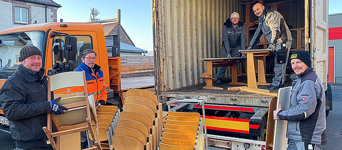 Die Bauhofmitarbeiter des Landkreises Steffen Apel (von links) und Richard Schwarz sowie Mitarbeiter der Speditions- und Möbeltransportgesellschaft Friedrich Friedrich laden gebrauchte Schultische und –stühle in einen Container, der für die Ukraine bestimmt ist. Foto: privat