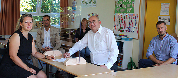 So wurde in jeder ersten Schulklasse ein Tisch mit einem Spuckschutz ausgestattet. Schulleiterin Carolin Klee erläutert den Sinn und Zweck dahinter: „Wenn Kinder Bedarf haben, können wir an diesen Erklär-Tischen etwas näher zusammenarbeiten, beispielsweise wenn wir den Kindern bei der Aussprache helfen oder ihnen ein bestimmtes Wort in einem Text erklären müssen. Das geht mit 1,5 Metern Abstand schlecht.“ Thomas Deppenkemper, der Geschäftsführer der Sozialen Förderstätten, freut sich, dass die Werkstätten mit den selbstgebauten Spuckschutz helfen können: „Dass wir mit unserer Marke Eigenbau den Schulalltag der Erstklässler erleichtern können, macht uns stolz.“ +++
