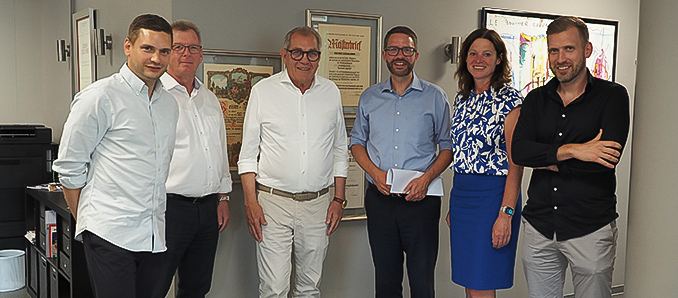 Moritz Müssig, Carsten Koch, beide Geschäftsführer der Karl Eidmann GmbH und Co.KG, Karl Eidmann, Landrat Thorsten Stolz, Bruchköbels Bürgermeisterin Sylvia Braun und Fabian Müssig, ebenfalls Geschäftsführer der Karl-Eidmann GmbH und Co.KG, tauschten sich über die aktuelle Situation des Unternehmens aus (v.l.). Foto: privat