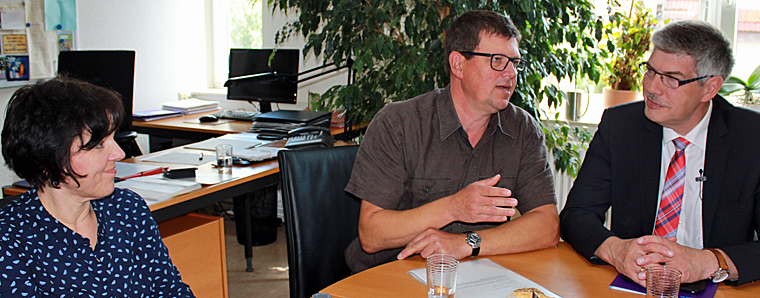Ausgiebiges sozialpolitisches Fachgespräch in der Diakonie-Einrichtung „La Strada“ in Alsfeld. Unser Foto zeigt von links die Leiterin des Diakonischens Werks Vogelsberg, Martina Heide-Ermel, Andreas Wiedenhöft und Landrat Manfred Görig. Foto: Erich Ruhl
