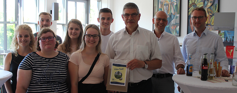 Johanna-Frances Lettow und Julia Heine (vorne links) überreichen Landrat Manfred Görig (Mitte) im Beisein von Erstem Kreisbeigeordnetem Dr. Jens Mischak und Hauptamtsleiter Ulrich Schäfer (von rechts) sowie den Vogelsberger Auszubildenden, die im Juli in den Partnerkreis Oberhavel reisen, ein Gastgeschenk. Foto: Sabine Galle-Schäfer