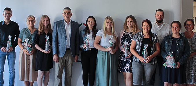 Super-Ergebnisse und dafür ein ganz dickes Lob vom Landrat: Von den sieben frisch gebackenen Verwaltungsangestellten, die jetzt ihre Ausbildung beendet haben, haben vier hervorragende 13 Punkte in der Abschlussprüfung erreicht. Und Eva Schössler kommt sogar auf die Höchstpunktzahl: Sie hat ihre Prüfung mit 15 Punkten abgeschlossen. „Bei solchen Auszubildenden muss uns um die Zukunft des Vogelsbergkreises keine Angst sein“, meinte denn auch Landrat Manfred Görig, der allen ganz herzlich zur bestandenen Prüfung und den überragenden Leistungen gratulierte. Gleichzeitig lobte er das Engagement dreier Mitarbeiterinnen, die ebenfalls sehr erfolgreich eine dreijährige Weiterbildung zur Verwaltungsfachwirtin absolviert haben.