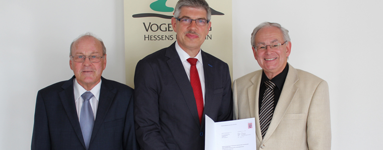 Claus Spandau vom Kompetenzzentrum für Interkommunale Zusammenarbeit bestätigte das und überreichte einen Zuwendungsbescheid des Landes in Höhe von 100.000 Euro. „Das ist die Höchstförderung“, erklärte er, „Sie sind hessenweit mit vorne an der Spitze was die Interkommunale Zusammenarbeit angeht.“ Die Besonderheit sei, dass im Vogelsbergkreis alle Städte und Gemeinden an einem Strang zögen, in vielen anderen Kreisen sei das nicht der Fall.