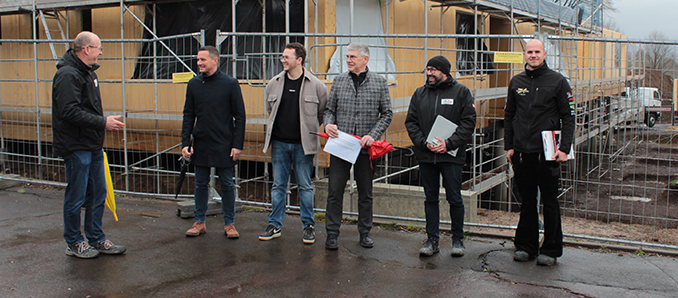 Gut voran gehen die Bauarbeiten am neuen Betreuungsgebäude an der Alsfelder Gerhart-Hauptmann-Schule. Schon in wenigen Tagen werden alle vorgefertigten Holzraumbauteile montiert sein. Am Dienstag besuchte Landrat Manfred Görig (Dritter von rechts) gemeinsam mit Jürgen Henke (technisches Gebäudemanagement), Schulleiter Angelo Müller, dem Leiter der Betreuung, Carlon Gleim, Stefan Schmidt (technisches Gebäudemanagement) und Bauleiter Paul Schwalm von der bauausführenden Firma Holzbau Schmidt (von links) die Baustelle in Alsfeld. Foto: Sabine Galle-Schäfer