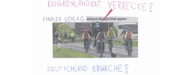 Auch in dem aktuellen Schreiben finden sich Formulierungen aus dem ausländerfeindlichen Sprachgebrauch. Über einer Fotomontage, die den Landrat in einer Radlergruppe zeigt, steht in Großbuchstaben der Aufruf „Kanakenlandrat verrecke!“. Ein Pfeil mache zudem unmissverständlich klar, wer die Zielperson sein soll. Darüber hinaus wird zum wiederholten Mal die Formulierung „Deutschland erwache!“ verwendet. Statt des bisherigen Schriftbildes, ist diesmal eine Buchstabenschablone eingesetzt worden. Die Ermittlungsbehörden sind über diese neue Entwicklung informiert.
