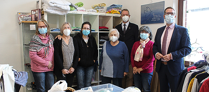 Bei seinem Besuch im Diakonieladen „Kostbar – Treffpunkt Diakonie“ in der Dreibrüderstraße 1 in Schlüchtern informierte sich der Landrat über das Laden-Projekt, das vom Kirchenkreis Kinzigtal getragen wird und ließ sich von Dekan Wilhelm Hammann und der Leiterin des Diakonieladens, Susanne Auth, die Abläufe in den 120 Quadratmeter großen Räumlichkeiten schildern. „Der Diakonieladen ist seit seiner erstmaligen Öffnung 2011 eine beliebte Anlaufstelle. Der Warenzulauf ist groß, auch die Nachfrage ist da. Es geht hier nicht nur um den Austausch von guten Waren zu günstigen Preisen, sondern auch darum, dass hier Menschen aufeinandertreffen, unabhängig von der Größe ihres Einkommens oder ihrer Nationalität“, sagte Wilhelm Hammann. Schnell habe sich herauskristallisiert, welches Konzept sinnvoll ist: Wer möchte, spendet seine gut erhaltenen, sauberen und neuwertigen Schuhe, Kleidung, Geschirr, Besteck oder Töpfe. Das Helferteam sichtet und sortiert die Waren, bevor sie ins Regal oder an den Kleiderständer kommen. „Hier ist viel Handarbeit nötig, aber die Arbeit macht Spaß und ist sinnvoll“, sagte Susanne Auth. „Es ist uns sehr wichtig, dass die angebotenen Sachen alle in einem sehr guten Zustand sind. Die Waren werden deshalb auch nicht verschenkt, sondern für wenig Geld angeboten und sind deshalb auch keine Almosen. Das hat etwas mit Würde zu tun“, sagte Wilhelm Hammann. „All diese wirklich noch verwertbare Kleidung und der Hausrat würden sonst vielleicht nutzlos in einem Schrank liegen. Hier besteht jedoch die Möglichkeit, damit anderen Menschen eine Freude zu machen, die sie gut gebrauchen können“, stellte der Landrat fest. Der Umgang mit den ganz unterschiedlichen Menschen, die in den Laden kommen, sei für das Helferteam mitunter eine Herausforderung, gerade wenn es um sprachliche Hürden geht. Jedoch überwiege immer auch die Freude daran, dass es eine sinnvolle Tätigkeit ist. Kein Wunder, dass viele aus der Anfangszeit immer noch dabei sind und mit anpacken, um den Laden am Laufen zu halten. Auch wenn das wegen der Einschränkungen durch die Corona-Pandemie nicht immer einfach war.