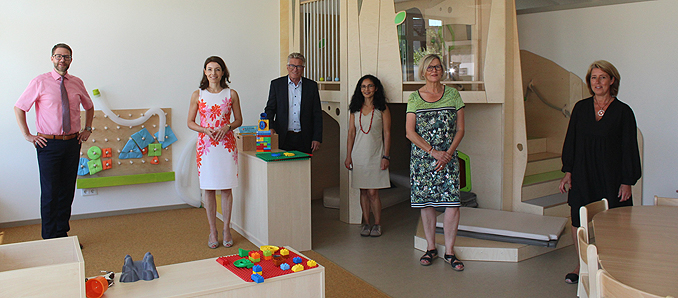 Kreisbeigeordneter Winfried Ottmann lobte die räumliche Nachbarschaft von Kindertagespflege, Kindertagesstätte und – perspektivisch – Elternkursen. „Gute Betreuung, Erziehung und Vernetzung zwischen den Eltern finden hier an einem Ort statt. Das lässt sich gut nutzen, insbesondere an den Übergangspunkten von U3- zu Ü3-Betreuung und von der Kita hin zur Schule. Das hilft aber auch, gerade mit Blick auf die entstehenden Wohngebiete in näherer Umgebung, um die Haushalte eines Quartiers enger zu verknüpfen“, sagte Ottmann. Das Familienzentrum an der Eichenheege soll in den kommenden Monaten weiter mit Leben erfüllt werden. Dazu gehört die Eröffnung zusätzlicher Betreuungsgruppen. Die auf einen späteren Termin verlegte Einweihungsfeier könnte also mit mehr als den derzeit rund 50 Betreuungskindern stattfinden. „Vielleicht ist das dann weniger die nachgeholte Einweihung und mehr eine Meilensteinfeier nach einem mehr als erfolgreichen Start“, meinte Landrat Thorsten Stolz. +++ pm