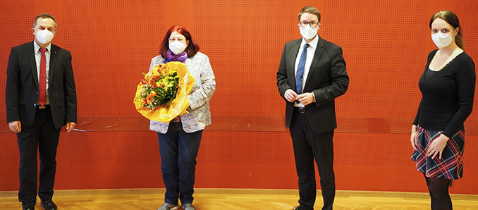 Vor einem knappen Jahr feierte Dr. Karin Bitterwolf, Leiterin der Stabsstelle „Krankenhaushygiene“, ihr 40-jähriges Dienstjubiläum im öffentlichen Gesundheitsdienst. Nun wurde sie von Landrat Thorsten Stolz in feierlichem, aber kleinen Rahmen in den Ruhestand verabschiedet. Ihr oberster Dienstherr überreichte der scheidenden Medizinaldirektorin die Entlassungsurkunde und würdigte sie für ihre großen Verdienste um die Krankenhaushygiene im Main-Kinzig-Kreis. „Trotz Corona wollen wir Dr. Karin Bitterwolf mit der ihr gebührenden Anerkennung aus unseren Reihen verabschieden“, sagte Thorsten Stolz. „Sie hat als Ärztin stets mit Verstand, Herz und Leidenschaft gehandelt und war damit in ihrer beruflichen Karriere erfolgreich.“ Sie habe sich in den acht Jahren, in denen sie für die Bürgerinnen und Bürger des Main-Kinzig-Kreises tätig war, Respekt und Anerkennung erworben.