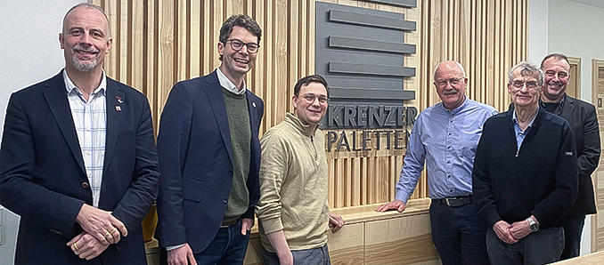 Im Anschluss führte die Tour zum Unternehmen Aloysius Krenzer GmbH & Co.KG im Poppenhausener Ortsteil Abtsroda, einer der größten Palettenhersteller in Europa. Das Unternehmen, das neben dem Hauptstandort des Palettensägewerkes in Abtsroda zwei weitere Sägewerk- Standorte in Biebergemünd (MKK) und Dorndorf (Thüringen) betreibt, ist bestrebt, langfristig tiefer in die nachhaltige Wertschöpfung zu gehen. „Die regionale Wertschöpfungskette darf nicht aus der Region gehen, da diese die Gemeinde und zudem die Region wirtschaftlich stabilisiert. Wir müssen den regionalen Unternehmen eine gute und nachhaltige Entwicklungschance hier in der Region bieten“, erklärte Sebastian Müller. Nicht zuletzt ist eine gute Zusammenarbeit mit HessenForst für das Unternehmen wichtig, da durch Massenerkrankungen von Waldbeständen in Hessen circa 40 Prozent der Fichtenbestände ausgefallen seien und diese auch zukünftig nicht zur Versorgung mit Nadelholz dienen werden.