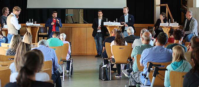 Bewohnerinnen und Bewohner von antonius : gemeinsam Mensch haben gestern vor dem Hintergrund der Hessischen Landtagswahl am 8. Oktober Fragen aus den Bereichen Gesundheit, Finanzen, Mobilität, Wohnen, Sicherheit, Arbeit, Politische Teilhabe und Umwelt in der Festscheune an die Direktkandidaten zur Landtagswahl im Landkreis Fulda adressiert. Auf dem Podium konnte der Geschäftsführer von antonius : gemeinsam Mensch, Sebastian Bönisch, die Direktkandidatin für den Fuldaer Wahlkreis 14 (Fulda I) Silvia Brünnel MdL (Bündnis 90/Die GRÜNEN), sowie der Direktkandidat der CDU Thomas Hering MdL (Fulda I), Dr. Szymon Mazur (Wahlkreis 14), Landtagskandidat Pascal Möller (Freie Wähler), Mario Klotzsche (FDP) sowie Wolfgang Lörcher (DIE LINKE.) begrüßen. Ebenso wohnte der komplette Vorstand des Beirats der Menschen mit Behinderungen (BMB) in Fulda, Lea Widmer (1. Vorsitzende) sowie ihre beiden Stellvertreterinnen, Elvira Storch und Manuale Pleterschek der Veranstaltung bei. Die St. Antonius-Stiftung wurde vertreten durch ihren 1. Vorsitzenden, Gerhard Möller.