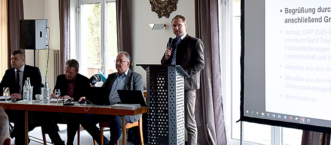 Im Anschluss informierte Ronny Mohr, kommissarischer Leiter des AWLR, über aktuelle Themen und rief die Ortslandwirte dazu auf, ihr Mitspracherecht bei Flächenverkäufen zu nutzen. Weiterhin wies Dorothea Mauß vom Sachgebiet Landwirtschaft und Agrarförderung, auf Neuerungen beim Online-Agrarantrag 2023 und das in diesem Jahr erstmals eingesetzte Flächenmonitoring per Satelliten hin. Für den 8. März sowie für Anfang April sind Informationsveranstaltungen zur GAP und zum Online-Agrarantrag geplant. Auch gab es von Markus Daum und Stefan Rhiel, beide Sachgebiet Landwirtschaft und Agrarförderung, Informationen zu den Wertigkeiten, beziehungsweise zum Umgang mit Kauf- und Pachtanfragen bei Freiflächen-PV-Anlagen, zur Stoffstrombilanz und zu den Bewirtschaftungsregelungen an Gewässerrändern sowie der Grünlandumwandlung.