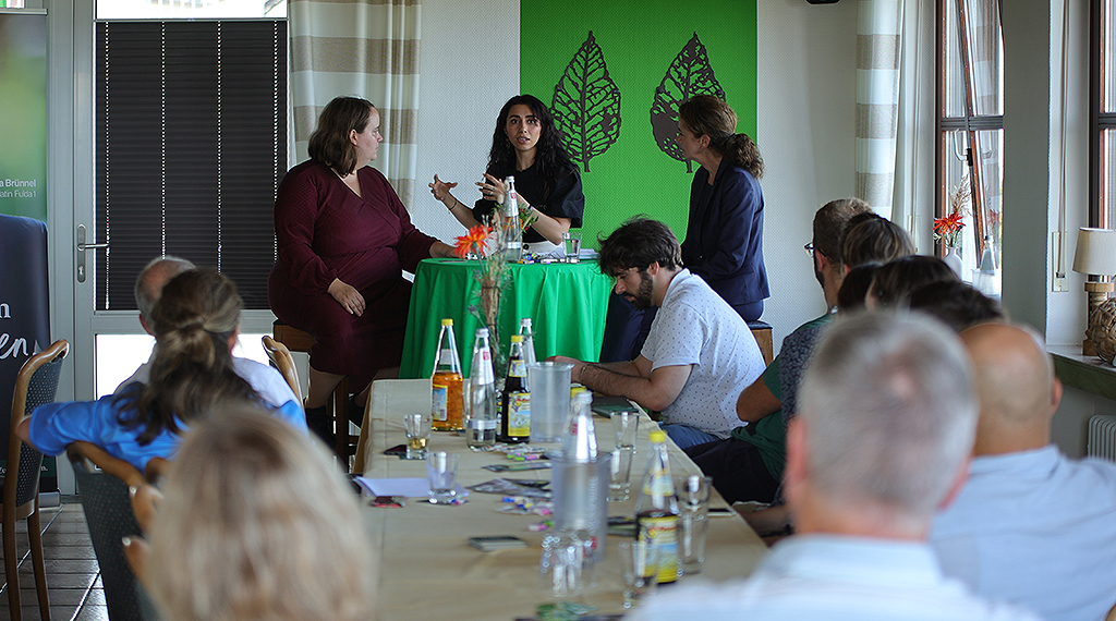Exil-Iranerin, Narges Sarjoughian, floh vor drei Jahren aus dem Iran. Aus dem Exil schaut sie mit Sorge auf ihr Heimatland und die Entwicklungen in ihm. In Deutschland setzt sich Sarjoughian für Frauen- und Menschenrechte im Iran ein und ist Ansprechpartnerin und Stimme von Kundgebungen gegen das iranische Regime, das sie gestern als menschenverachtend und grausam beschrieb. Auf Brünnels Frage, wie sie die Gewaltenteilung in Deutschland erlebe, antwortete sie, dass sie auch hier „in ständiger Angst“ lebe, denn nicht allen Menschen gefiele, was sie tue. Die Exil-Iranerin weiter: „Das Regime im Iran ist sehr grausam, es schreckt nicht davor zurück, Frauen zu verurteilen, zu vergewaltigen oder hinzurichten. Wir dürfen uns nicht so kleiden, wie wir wollen, wir dürfen abends nicht mehr auf die Straße, wir dürfen kein Fahrrad fahren. Wenn Frauen ihr Haus ohne Kopftuch verlassen und auf die Straße gehen, riskieren sie, vergewaltigt zu werden. Das Regime sieht uns nicht als Menschen. Einmal öffentlich das auszusprechen, was wir tatsächlich denken und fühlen, im Iran ist das undenkbar.“ Aber es sei durch die Bewegungen auch hier in Deutschland ein neues Selbstbewusstsein der Frauen im Iran erkennbar. Um eine feministische Außenpolitik komme man nach Narges Sarjoughian nicht mehr drumherum. „Andere Regierungen arbeiten mit solch einem Regime wie dem im Iran zusammen“, so Sarjoughian mit diesem Satz sie auch eine unausgesprochene Bitte an andere Länder zur Unterstützung adressierte. „Wir brauchen eine feministische Außenpolitik auch der anderen Länder wegen“, sagte sie.