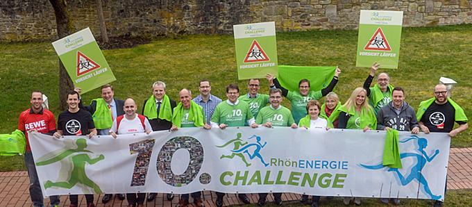 Stellten im Kreise der Sponsoren das Programm zur 10. RhönEnergie Challenge vor: Fuldas Oberbürgermeister Dr. Heiko Wingenfeld als Schirmherr (8. von links), der Sprecher der Geschäftsführung der RhönEnergie Fulda, Martin Heun (10. von links), sowie die Veranstalter Andreas Nann (9. von links) und Jürgen Stumpf (3. von rechts). Foto: re-fd