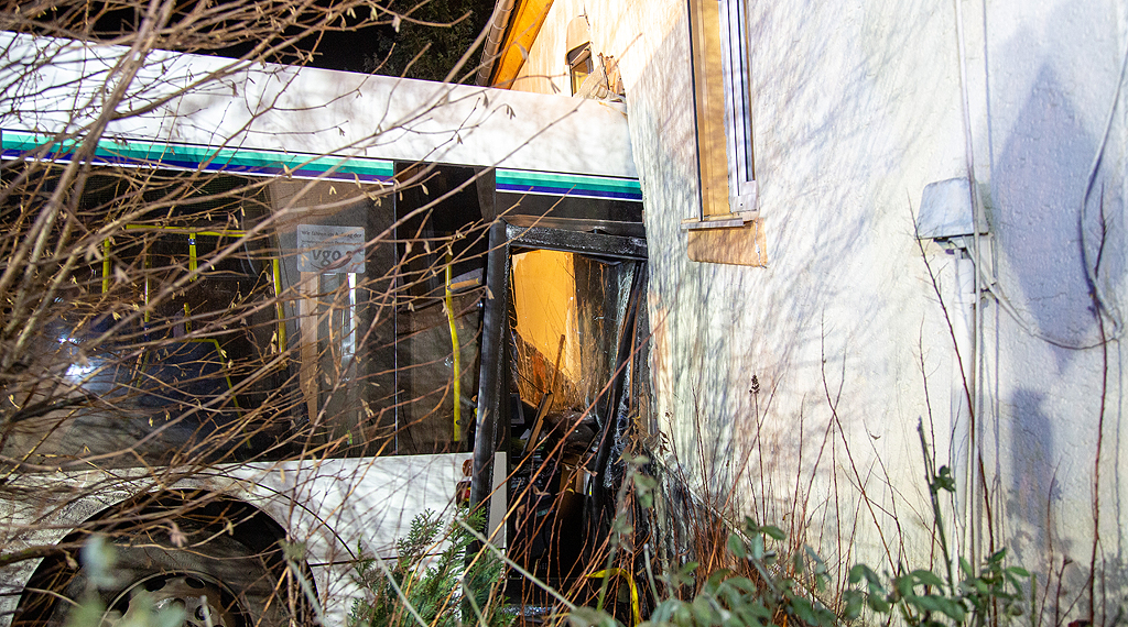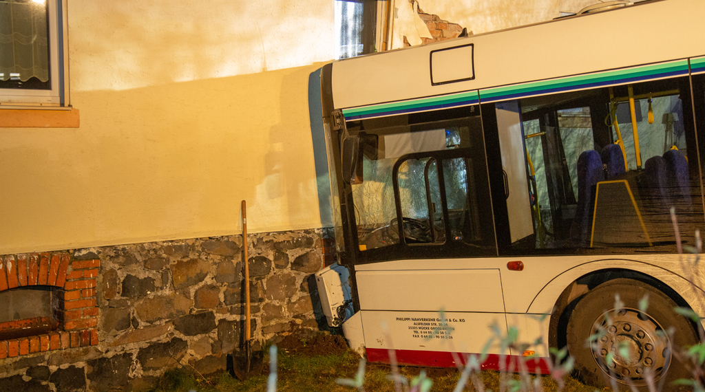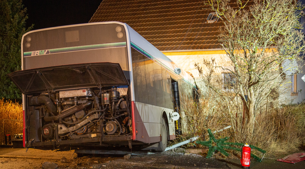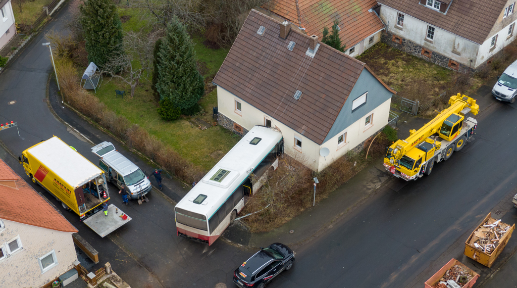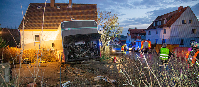 Gegen 06:30 Uhr ging bei der Polizei in Fulda über Notruf die Mitteilung ein, dass in Ulrichstein, Ohmstraße, ein Linienbus beim Versuch, einem Wild auszuweichen, von der Fahrbahn abkam und gegen eine Hauswand prallte. Vor Ort konnte durch die Streife festgestellt werden, dass der Bus, der ohne Fahrgäste unterwegs war, bei dem Ausweichversuch nach links von der Fahrbahn abkam, über ein Gartengrundstück fuhr und gegen die Hauswand prallte. Zur Unfallzeit hielten sich keine Personen in dem Haus auf. Der Busfahrer wurde durch den Aufprall leicht verletzt. An Bus und Haus entstand erheblicher Sachschaden: Der Schaden am Bus allein wird auf rund 60.000 Euro geschätzt, der gesamte Schaden an Haus und Bus inklusive Bergungskosten dürfte sich auf etwa 100.000 Euro summieren, zumal das Haus wohl einsturzgefährdet ist. „Wir wussten anfangs nicht, ob viele Personen im Bus waren, das war aber nicht der Fall. Wir haben dann den Bus und das Haus gesichert und anschließend das THW angefordert. Nun wird die Statik des Hauses geprüft. Wenn es nicht einsturzgefährdet ist, kann der Bus entfernt werden“, sagte ein Sprecher der Feuerwehr. Die Ohmstraße ist im Bereich der Unfallstelle aktuell voll gesperrt. +++