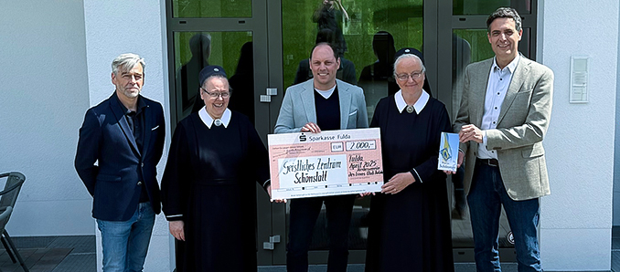 Das Schönstatt-Zentrum Dietershausen durfte sich über eine großzügige Spende in Höhe von 2.000 Euro freuen. Der Lions Club Fulda unterstützt mit diesem Betrag die kürzlich abgeschlossenen Umbauarbeiten der Jugendräume im Zentrum. Präsident Björn Steinacker, Vize-Präsident Michael Engels und Past-Präsident Dirk Eckerscham überreichten den symbolischen Scheck an Schwester M. Birgitta Binder, die Hausleiterin des Zentrums.