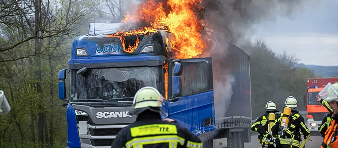 Gerade noch rechtzeitig bemerkte der Fahrer eines Sattelzuges am Nachmittag eine Rauchentwicklung in seiner Fahrerkabine. Der Mann handelte umgehend und brachte sein Gespann auf dem Standstreifen bei Fulda-Nord auf der A7 zum stehen. Weitere LKW-Fahrer und Transporter hielten an. Gemeinsam versuchten diese den Entstehungsbrand mit sechs Feuerlöschern unter Kontrolle zu bringen - vergeblich. Als die ersten Einsatzkräfte der Feuerwehr vor Ort eintrafen hatte sich der Brand bereits auf die gesamte Zugmaschine ausgebreitet. Die Feuerwehr konnte durch einen schnellen Löschangriff das Übergreifen der Flammen, auf den mit Möbelteilen beladenen Auflieger, verhindern. Verletzt wurde glücklicherweise niemand. Die Zugmaschine brannte vollständig aus. Die Polizei rechnet mit einem Sachschaden von 100.000 Euro. Möglicherweise wurde der Brand durch einen Camping-Kocher ausgelöst, die Ermittlungen dazu dauern jedoch an. Durch die Sperrmaßnahmen aufgrund des Einsatzes kam es auf der A7 zu einem massiven Rückstau. +++ Mehr Blaulichtberichte auf unserer Blaulichtseite - osthessen112.