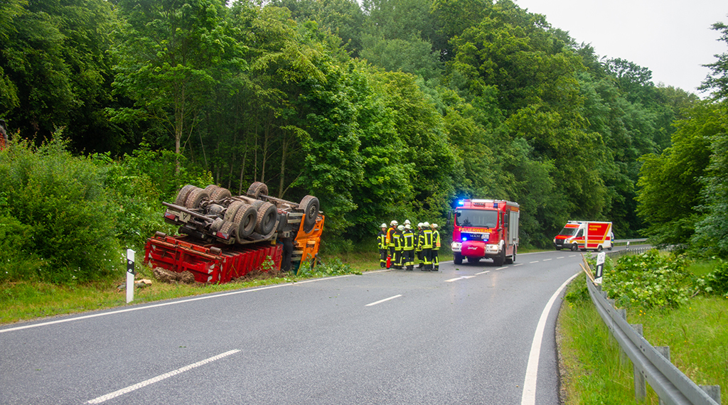 In einen Graben gefahren und umgekippt ist ein Lkw auf der B458 zwischen Brand und Wickers in der Gemeinde Hilders gegen 15.20 Uhr. Aufgrund des starken Regens und Dauernässe war der Untergrund sehr weich. Der beladene LKW fuhr mit der rechten Fahrzeugseite auf dem schmalen Weg offenbar am Rand. Plötzlich gab der Untergrund zu dem kleinen Abhang in Richtung B 458 nach. Der LKW rutschte die Böschung herab, überschlug sich einmal und kam auf dem Dach, im Graben neben der Fahrbahn der B458, zum Liegen. Der Fahrer konnte unverletzt und selbstständig den LKW verlassen. Die Bergung des LKW erfolgte mit zwei schweren Einsatzkränen. Die Freiwillige Feuerwehr musste einen auf die Straße ragenden Baum und Astwerk entfernen. Andere Fahrzeuge waren nicht beteiligt. Es entstand Sachschaden in Höhe von circa 25.000 Euro. Die Fahrbahn war im Rahmen der Bergungs- und Aufräumarbeiten bis etwa 20 Uhr voll gesperrt. +++