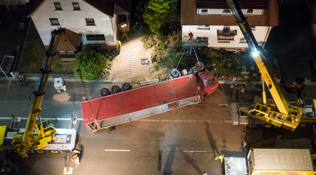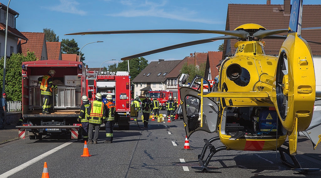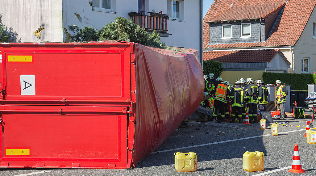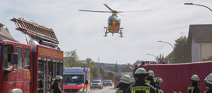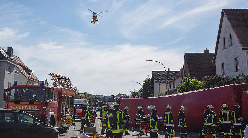 Doch keine ungewöhnlichen Bilder für Gemeindebrandinspektor Henning und auch nicht für Thomas Hoffmann, der auch Mitglied in einer Feuerwehr ist. Deswegen zögert er auch nicht, zu helfen: "Da muss man halt Ruhe bewahren". Befreien kann Hoffmann den Fahrer nicht und auch die Kollegen von der Feuerwehr haben ihre liebe Mühe, denn der Lastwagenfahrer ist unter dem Führerhaus eingeklemmt. Mittels Hebekissen wird das schwere Gefährt, beladen mit 15 Tonnen Hackschnitzel, angehoben, damit der Rettungsdienst den Verletzten Befreien kann. Nach einer Erstbehandlung ,fliegt ein Rettungshubschrauber den Mann in ein Krankenhaus.