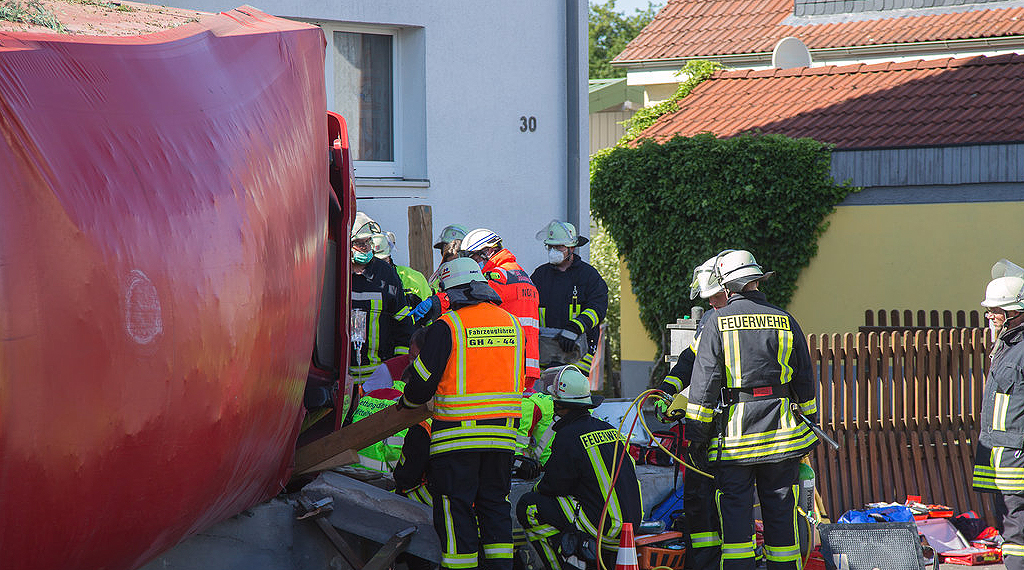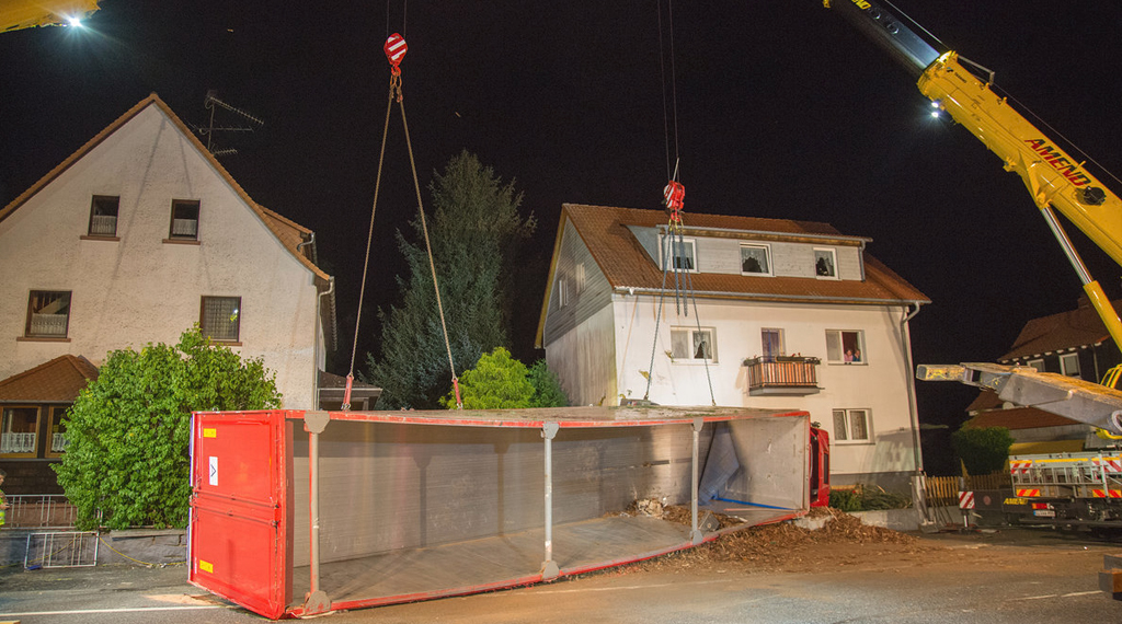 Am Donnerstag hat sich gegen 17 Uhr in der Bahnhofstraße in Grebenhain ein schwerer Lkw-Unfall ereignet. Ein Lastwagen hat hierbei zwei Autos beschädigt, eine Gartenmauer durchbrochen und ist schließlich an einer Hauswand auf der Seite zum Liegen gekommen. Der Lkw-Fahrer, der rund 20 Tonnen Hackschnitzel geladen hatte, war nach ersten Informationen auf der Bahnhofstraße aus Grebenhain kommend in Richtung Vaitshain unterwegs. Aus noch ungeklärter Ursache kam er von der Fahrbahn ab, fuhr gegen zwei geparkte Pkw, durchbrach eine Gartenmauer, kippte dabei um und kam dann an der Hauswand – halb im Vorgarten und halb auf der Straße – zum Liegen. Auch Bäume wurden durch den Unfall umgerissen. Der Fahrer war in seinem Führerhaus eingeklemmt und musste durch die Feuerwehr befreit werden. Er wurde verletzt mit dem Hubschrauber in ein Krankenhaus gebracht. Die Straße musste voll gesperrt werden. Es entstand ein Sachschaden von rund 250.000 Euro.