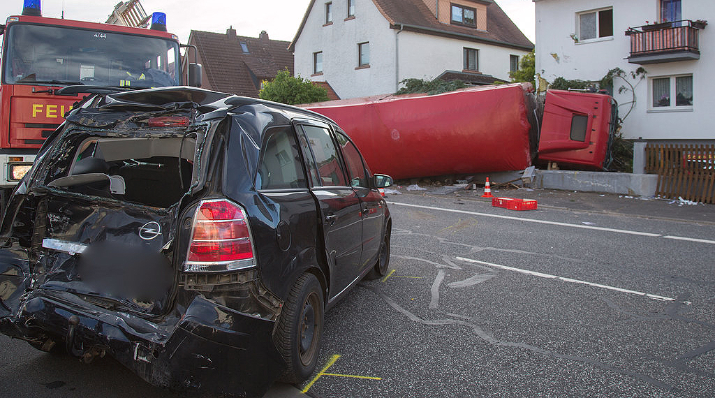 "Das hätte auch anders ausgehen können", so die Worte von Mario Henning dem Gemeindebrandinspektor von Grebenhein, als Resümee zu dem Verkehrsunfall, der sich einige Zeit vorher ereignet hat. Anwohner Wilhelm Fischer, der das Geschehen mit eigenen Augen beobachtet hat, äußert sich ähnlich: "War Glück, dass niemand hier lief". Er stand vor seiner Haustür, als der Lastwagen von oben angerauscht kam, erst ins Schlittern, dann ins Schleudern geriet und anschließend umkippte und das Haus des Nachbarn traf. Wie schnell der Lastwagen war, daran kann sich Wilhelm Fischer nicht erinnern. Thomas Hoffmann hingegen, der mit seinem Sohn vor seiner Firma oben auf der Straße stand, ist hingegen anderer Meinung: "Der Lkw kam von oben angeschossen, hat dann zwei Autos touchiert und ist dann gegen die Hauswand geflogen und ist dann im Kippen gewesen". Szenen, die eher an einen Aktionfilm denken lassen, als an einen gemütlichen Sommertag in einer Gemeinde.