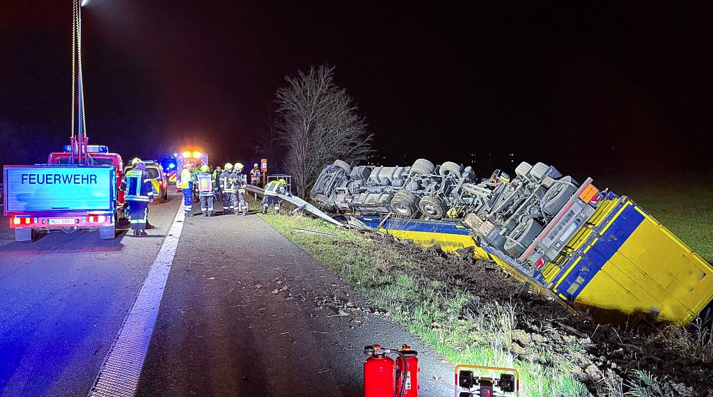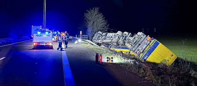 Die Unfallursache und die Schadenshöhe sind nun Gegenstand polizeilicher Ermittlungen. Für die Dauer der Einsatzmaßnahmen wurde der rechte Fahrstreifen gesperrt, was aufgrund der Uhrzeit jedoch zu keinen Verkehrsbeeinträchtigungen führte. Die Bergung des verunfallten Gliederzugs wird voraussichtlich bis in den Freitagmittag andauern, wobei es auch zu Sperrungen kommen kann. +++ pm