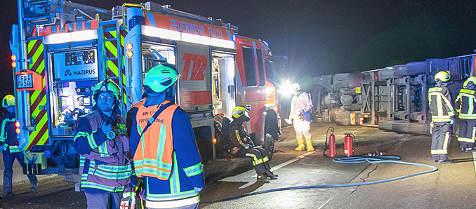 Ein LKW-Fahrer aus Rumänien geriet am Montag gegen 23:15 Uhr auf der A7 bei Fulda Nord in die Leitplanke. Der 61-Jährige verlor mit seinem Beifahrer, der 56 Jahre alt ist, die Kontrolle über den Scania-Sattelzug. Das Gespann fuhr zuerst in die Betonleitwand links; danach schleuderte es über alle Spuren und kippte auf die Seite. Der Fahrer und sein Kollege erlitten zum Glück nur leichte Verletzungen – andere Verkehrsteilnehmer halfen ihnen aus dem Führerhaus. Ein Rettungswagen versorgte sie sofort am Unfallort; der Beifahrer kam später ins Krankenhaus. Die Berufsfeuerwehr Fulda, Autobahnmeisterei und Autobahnpolizei Petersberg rückten an.