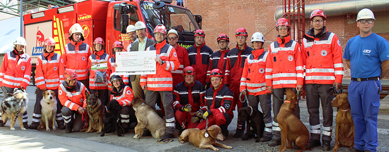 Wurden für ihre besondere Form des ehrenamtlichen Engagements belohnt: die Rettungshundestaffel des DRK-Kreisverbandes Rotenburg. Bei einer gemeinsamen Übung mit den Höhenrettern der Werkfeuerwehr von K+S in Heringen übergab Landrat Dr. Michael Koch an Staffelleiter Dirk Krapf einen Scheck über 1400 Euro.