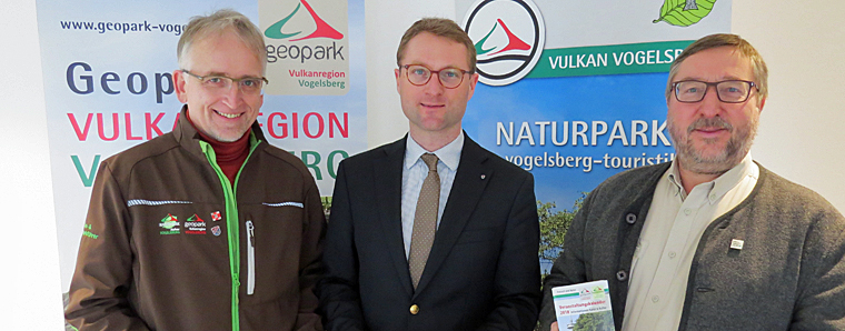 Hartmut Greb (Geopark), Erster Kreisbeigeordneter Dr. Jens Mischak und Rudolf Frischmuth (Naturpark) wollen Lust machen auf Ausflüge in den Vogelsberg. Foto: Susanne Jost