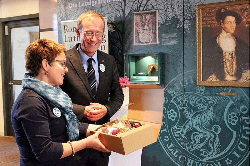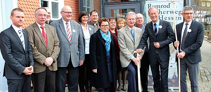 Reformationsjubiläums, soll der Lutherweg quer durch Hessen vollständig entwickelt, beschildert und mit der nötigen Infrastruktur ausgestattet sein. Für dieses Vorhaben gab es vergangenen Freitagmittag gleich doppelt Unterstützung: Staatsminister und Chef der Hessischen Staatskanzlei Axel Wintermeyer überreichte dem Verein „Lutherweg in Hessen e.V.“ eine Förderzusage des Landes in Höhe von 317.800 Euro. Und auch Landrat Görig bzw. die Sparkassen-Stiftung hatte eine erfreuliche Mitteilung zu machen: Die Sparkasse Oberhessen wird die Kostenanteile der Kommunen für die rund 68 Kilometer lange Strecke im Vogelsbergkreis von rund 25.000 Euro übernehmen.