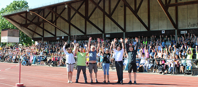 Die Schulleitungen der Friedrich-Fröbel-Schule (Maintal), Frida-Kahlo-Schule (Bruchköbel), Martinsschule (Linsengericht) und Heinrich-Hehrmann-Schule (Schlüchtern) sowie Landrat Thorsten Stolz eröffneten das Sport- und Spielfest gemeinsam, wobei sie nicht viel brauchten, um der am Morgen vollbesetzten Zuschauertribüne einzuheizen. „Wichtig ist, dass heute alle ihre Freude haben und das für sich entdecken, was ihnen richtig Spaß macht, ob das nun Fußball, Leichtathletik oder Geocaching ist“, sagte Thorsten Stolz.