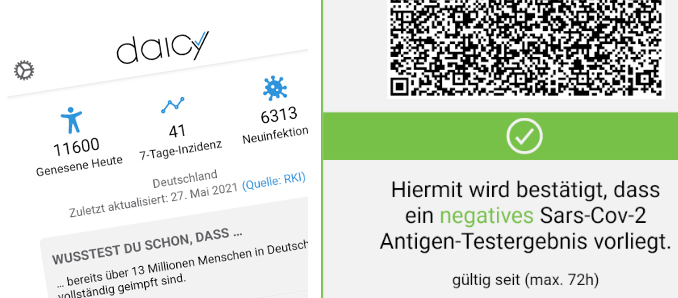 Mit dem weiterhin äußert relevanten Kontakttagebuch und den zusätzlichen Möglichkeiten zur Meldung von Antigen-Testergebnissen, dem zuverlässigen Double Check-In und der fälschungssicheren Darstellung von zertifizierten Testergebnissen liefert die App in dieser Kombination unter anderem die Basis für eine strukturierte Öffnung von Handel, Gastronomie und Veranstaltungen und für eine zuverlässige Erfassung möglicher Infektionswege ohne Datenverluste und Übertragungsfehler. DAICY ist zudem kompatibel mit den aktuellen und künftigen Funktionen der offiziellen Corona-Warn-App.