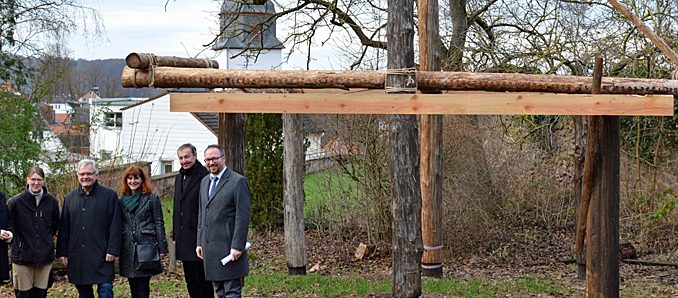 Im Nidderauer Stadtteil Windecken wird „Geschichte gebaut“. Die sechs stattlichen Holzpfähle und die Querträger im Hexenturmgarten lassen bereits sehr deutlich erkennen, dass hier ein einzigartiges Bauwerk entsteht. Auch für Landrat Thorsten Stolz ist „diese Zeitreise in die Jungsteinzeit ein äußerst interessantes Projekt“, das der Main-Kinzig-Kreis jetzt über die Kulturförderung mit 10.000 Euro unterstützt. Gemeinsam mit Nidderaus Bürgermeister Gerhard Schultheiß, Kulturamtsleiter Matthias Schmitt und der Leiterin des Zentrums für Regionalgeschichte, Christine Raedler, besuchte er das Gelände, wo das so genannte Langhaus künftig stehen soll. Die Pläne orientieren sich unter anderem an den entsprechenden Ausgrabungen in der Neuen Mitte von Nidderau, wo die rund 7.000 Jahre alten Spuren aus der Jungsteinzeit (Neolithikum) bereits 2011 im Rahmen der Erschließung freigelegt wurden.