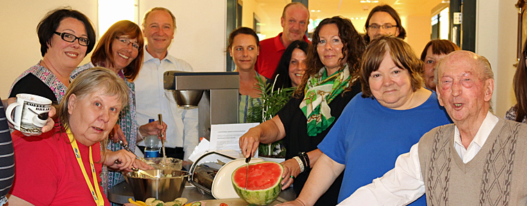 Gelnhausen. Gerade wird eine saftige Wassermelone aufgeschnitten, daneben locken Weintrauben und Käsewürfelchen auf Holzspießen, verschiedene Salatsorten sind in Schüsseln angerichtet. „Das sieht lecker aus“, kommentiert eine Bewohnerin der Senioren-Dependance Haus Neuberg. Seit kurzem sind in dem Neubau zwischen den Ortsteilen Ravolzhausen und Rüdigheim nicht nur betagte Bürger, sondern auch Menschen mit psychischen Erkrankungen untergebracht. Sozialdezernentin Susanne Simmler besuchte kürzlich die neue Einrichtung und traf zum gemeinsamen Abendessen „eine nette Hausgemeinschaft“.