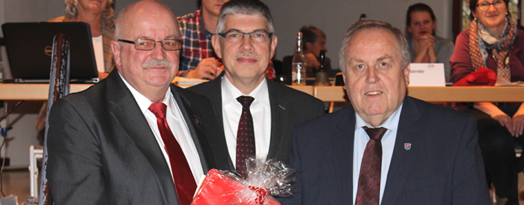 Manfred Hasemann (li.) wurde von Landrat Manfred Görig (Mitte) und dem Kreistagsvorsitzenden Dr. Hans Heuser für sein jahrzehntelanges beispielhaftes Engagement mit der höchsten Auszeichnung des Vogelsbergkreises geehrt. Foto: Gaby Richter