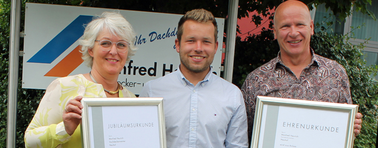 Dachdecker- und Spenglermeister Manfred Heurich (59) aus Neuhof-Dorfborn konnte jetzt im Doppelpack sein 25-jähriges Betriebsjubiläum und auch sein 25-jähriges Meisterjubiläum feiern. Ursprünglich hatte Heurich Einzelhandelskaufmann gelernt, sattelte dann aber beruflich nochmal um. Unmittelbar nach seiner Gesellenprüfung zum Dachdecker, begann er 1992 mit der Meisterausbildung.