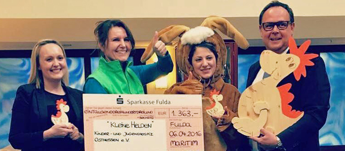 Janine Becker (Regionalverkaufsleiterin Maritim), Elena Ditz (Kleine Helden e.V.), Gurbet Yavsan (Osterhase Maritim), Wolfgang Sulzbacher (Hoteldirektor Maritim). v.l.n.r.