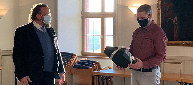 Aufgrund seiner Wahl zum Bürgermeister der Gemeinde Kalbach verlässt Mark Bagus nach über 20 Jahren die Gemeindeverwaltung Eichenzell mit einem lachenden und einem weinenden Auge. Am 18.12.2020 verabschiedete Bürgermeister Johannes Rothmund (CDU) den langjährigen Kassenleiter Mark Bagus im kleinen Kreis und unter Einhaltung der Abstands- und Hygieneregeln im Eichenzeller Schlösschen.