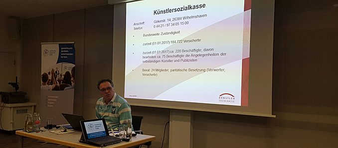 Andreas Kissling von der Künstler Sozialkasse in Wilhelmshaven stellte Struktur und Leistungen der Künstler Sozialkasse vor. Er betonte, dass das Durchschnittseinkommen der  gut 180.000 Mitglieder der Künstler Sozialkasse bei 16.495 Euro im Jahr vor Steuern läge. Die Künstler Sozialkasse finanziere sich zu 50 Prozent Einzahlungen der Künstler, zu 30 Prozent aus Abgaben der Unternehmen und zu 20 Prozent aus einem Bundeszuschuss. Dabei würden selbständige Künstler wie Arbeitnehmer behandelt und zahlten nur die Hälfte der Sozialabgaben. Unternehmen, die selbständige Künstler, Freiberufler oder Einzelunternehmer, beauftragten müssten eine Abgabe in Höhe von 4,2 Prozent des die künstlerische Leistungen betreffenden Auftragsvolumens an die Künstlersozialkasse abführen. Die Prüfung der Abgabepflicht erfolge spätestens alle 4 Jahre mit den Lohn- und Gehaltsprüfungen durch die Deutsche Rentenversicherung. +++