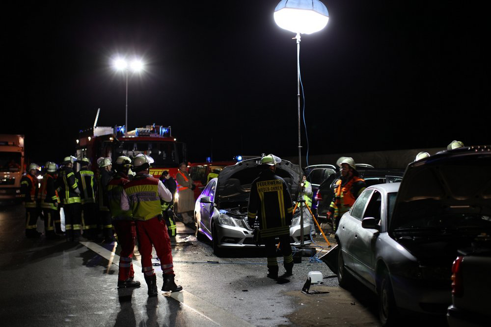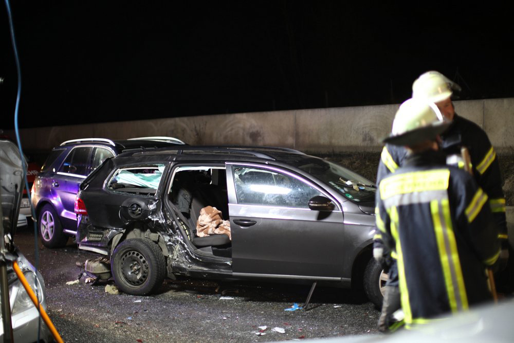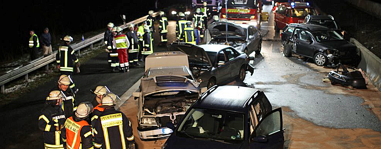 Homberg (Ohm). Zu einem Massenunfall kam es am Sonntagabend auf der A5 im Vogelsbergkreis. 12 Autos prallten zwischen den Anschlussstellen Homberg (Ohm) und Alsfeld-West in Fahrtrichtung Kassel aufeinander. Ein 37-jähriger Braunschweiger verlor aus bisher nicht bekannter Ursache die Kontrolle über seinen Pkw, schleuderte nach rechts und links gegen die Leitplanken und kam quer zur Fahrbahn zum Stillstand. Die nachfolgenden Verkehrsteilnehmer konnten ihre Fahrzeuge nicht mehr rechtzeitig abbremsen. Es kam in kurzer Folge zu weiteren Auffahrunfällen mit 11 beteiligten Pkw. Dabei wurden sieben Personen, größtenteils durch Prellungen, verletzt, darunter auch der Unfallverursacher. Sie wurden in den Kliniken Alsfeld und Gießen zum Teil stationär untergebracht. Während der Unfallaufnahme und der Bergung der Fahrzeuge war die Fahrbahn in Richtung Nord voll gesperrt. Der Verkehr wurde an der Anschlussstelle Homberg/Ohm auf die Umleitungsstrecke abgeleitet. Gegen 23.10 Uhr war die Unfallstelle geräumt und beide Fahrstreifen wieder frei. An der Unfallstelle bildete sich wegen des geringen Verkehrsaufkommens lediglich ein Rückstau von 3 km. Den Sachschaden gibt die Polizei mit etwa 100.000 Euro an. +++ fuldainfo | pw
