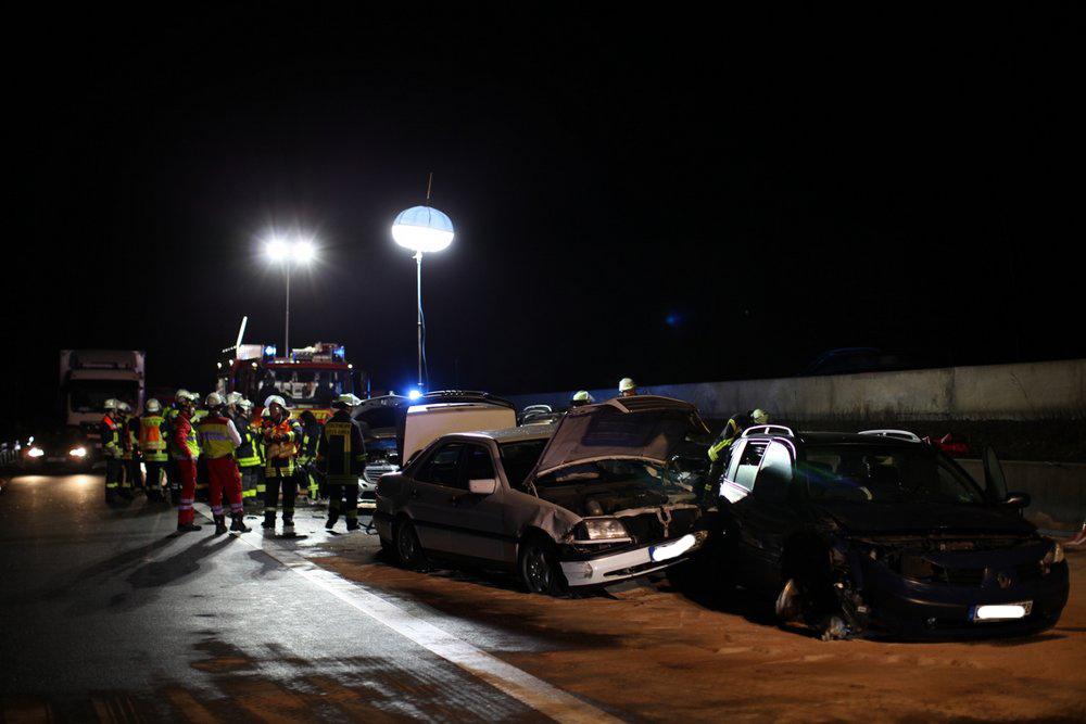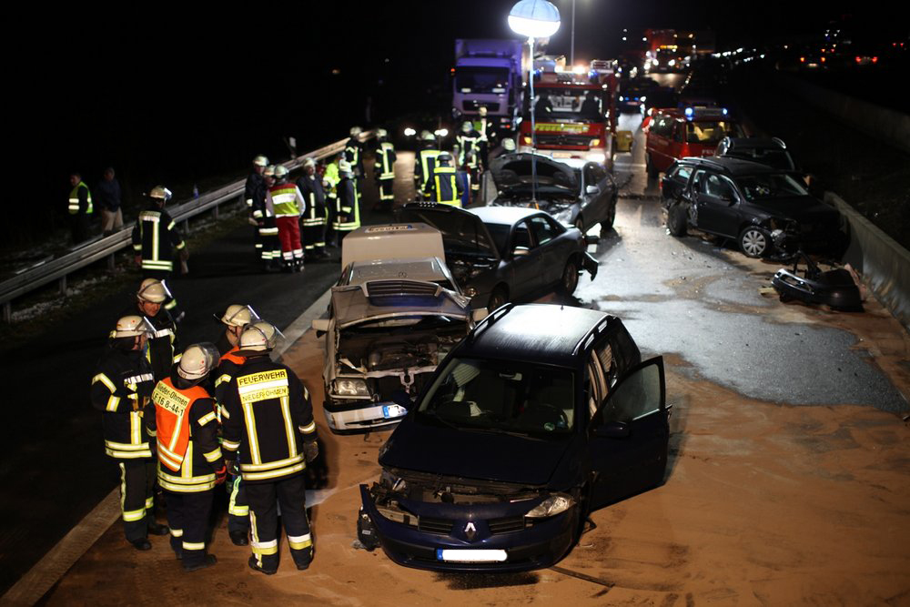 Homberg (Ohm). Zu einem Massenunfall kam es am Sonntagabend auf der A5 im Vogelsbergkreis. 12 Autos prallten zwischen den Anschlussstellen Homberg (Ohm) und Alsfeld-West in Fahrtrichtung Kassel aufeinander. Ein 37-jähriger Braunschweiger verlor aus bisher nicht bekannter Ursache die Kontrolle über seinen Pkw, schleuderte nach rechts und links gegen die Leitplanken und kam quer zur Fahrbahn zum Stillstand. Die nachfolgenden Verkehrsteilnehmer konnten ihre Fahrzeuge nicht mehr rechtzeitig abbremsen. Es kam in kurzer Folge zu weiteren Auffahrunfällen mit 11 beteiligten Pkw. Dabei wurden sieben Personen, größtenteils durch Prellungen, verletzt, darunter auch der Unfallverursacher. Sie wurden in den Kliniken Alsfeld und Gießen zum Teil stationär untergebracht. Während der Unfallaufnahme und der Bergung der Fahrzeuge war die Fahrbahn in Richtung Nord voll gesperrt. Der Verkehr wurde an der Anschlussstelle Homberg/Ohm auf die Umleitungsstrecke abgeleitet. Gegen 23.10 Uhr war die Unfallstelle geräumt und beide Fahrstreifen wieder frei. An der Unfallstelle bildete sich wegen des geringen Verkehrsaufkommens lediglich ein Rückstau von 3 km. Den Sachschaden gibt die Polizei mit etwa 100.000 Euro an. +++ fuldainfo | pw